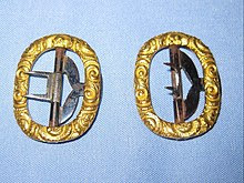 A pair of buckles for dress breeches. The T-hook of the buckle is inserted into a buttonhole located on the strap at the bottoms of the leg of the breeches. The end of the strap is slipped through, the prongs lowered and then the end slipped through the other side of the buckle.